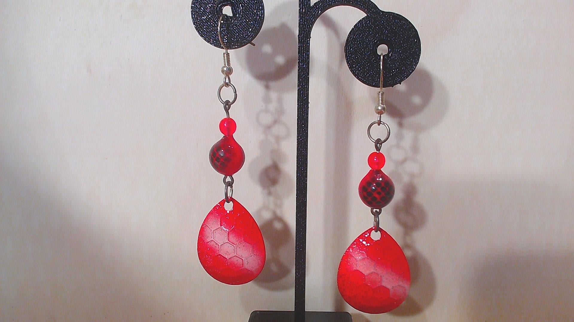 Dangle earrings made from multi-colored spinning lures, small red fishing beads, and red and black foam fishing floats